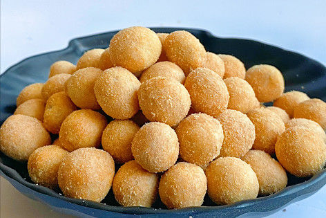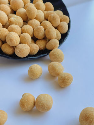 لایه ای از آرد ترد و روکش نشاسته در قسمت بیرونی بادام زمینی پر بدن،
